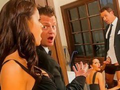 La jefa de su esposa es una morena de pelo corto con una pinta de lesbiana acojonante y las pilló a la dos follando pero estaban tan cachondas que se las folló a las dos con su enorme tranca por todos los orificios.